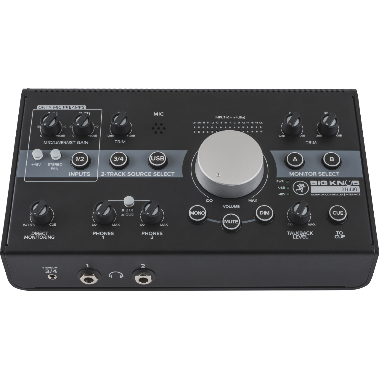 Mackie Big Knob Studio combines premium 96khz / 24-bit recording with the proven performance of the world's bestselling monitor controller. Capture world-class recordings via dual Onyx preamps and professional studio features like zero-latency overdubbing and built-in talkback for artist communication. Easily select from three sources, including USB playback from your DAW, and switch between two pairs of studio monitors. Only Big Knob Studio ensures balanced listening levels, offering independent gain trim on all inputs and outputs. Two separate headphone outs are available, each with separate level control. Plus, there's even a handy front-panel input for your smartphone. Big Knob Studio is the ultimate compact studio solution - just add monitors.