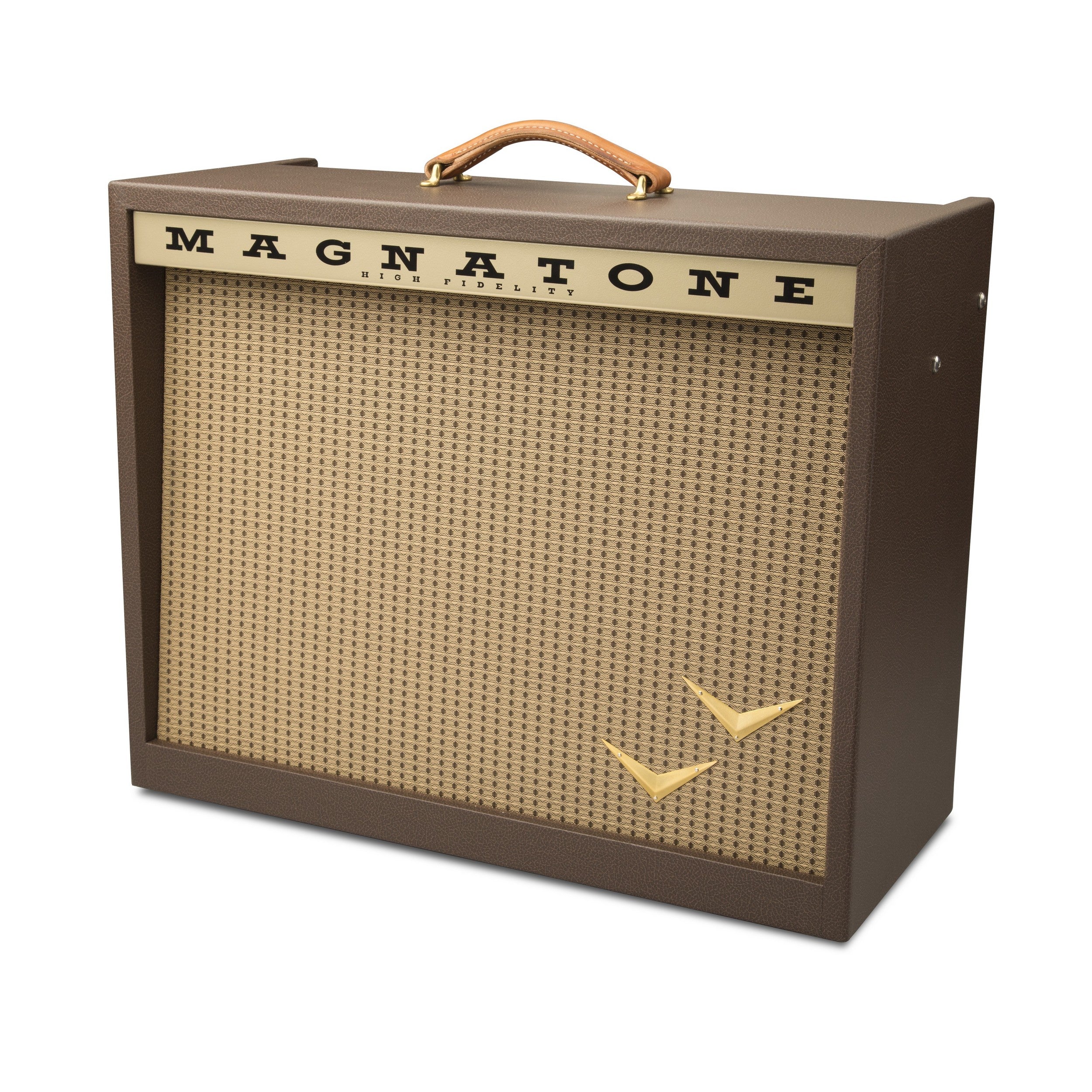 Clothed in the vintage brown and gold cosmetic, the Panoramic Stereo brings the Magnatone stereo experience to a smaller , more convenient size. Two 10" speakers are powered by four EL84s push pull 12+12 watts of all tube stereo power for a very compact and wide sounding amplifier.