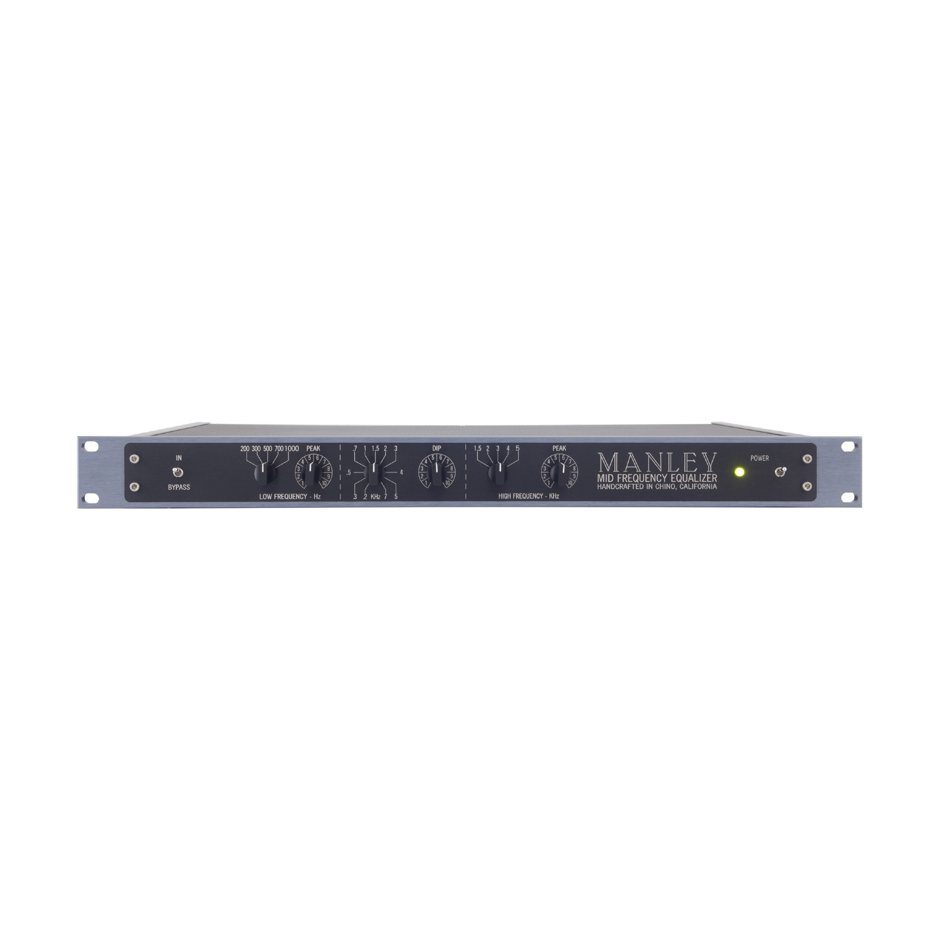 Specially useful for midband oriented instruments such as guitars, vocals, harmonicas, and violins, the MID FREQUENCY ENHANCED PULTEC EQ (MEQ-5 type) shares the same features and specifications as Manley's 'EQP-1A' version. The differences lie in the passive EQ section: In the MID EQ, the DIP and PEAK controls function on much sharper bell-shaped curves centered on the selected frequencies, which gives the engineer-producer more precise control over the vitally important midrange and makes this unit indispensable for mastering engineers. The MID EQ also completely fills the frequency gaps between the low frequency and high frequency sections of the Enhanced Pultec EQP-1A type EQ; thus the combination of the two provides a most flexible palette of possibilities for tracking or mastering.