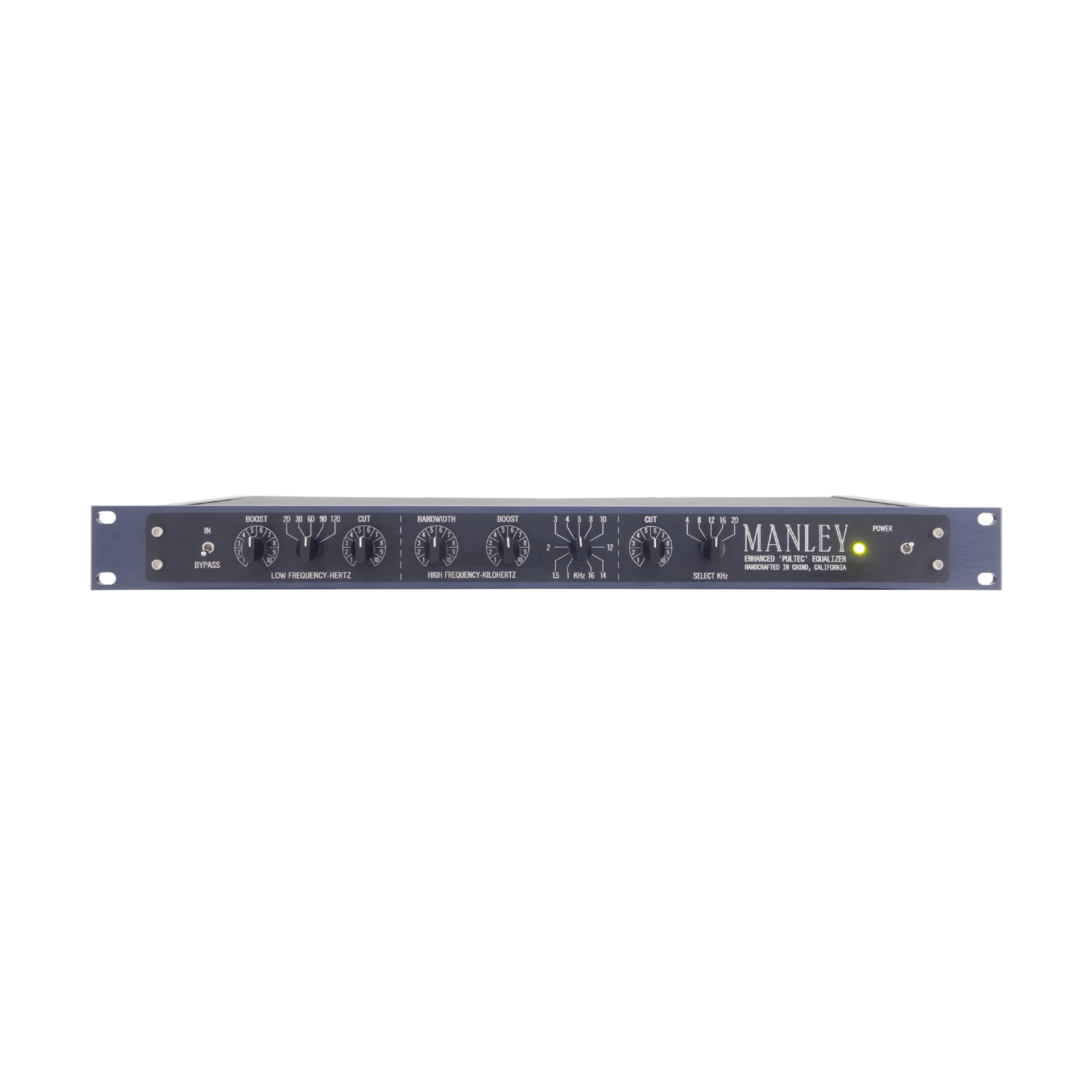 The Manley Enhanced Pultec EQP-1A is Manley's interpretation of the historic Pultec Equalizer as originally produced by Pulse Techniques, Inc. They have been building these Manley Pultec EQs since 1990 after they bothered to hunt down Eugene Shenk in New Jersey to ask for his permission and blessings to produce their own version of his classic piece. These enhanced Pultec units employ Manley's simple and clean all-tube make-up gain block to reamplify the signal after the passive EQ circuit. EQ may be set to 'flat' positions or BYPASSED entirely. All BOOST and CUT controls are continuously variable conductive plastic potentiometers for absolutely silent operation and long life. These single rack unit monoblocks occupy one-third of the space of the 'antique Pultecs', an important consideration for allocation of outboard rack space. And if you notice, a couple extra frequencies have been added too. The rear mounted input switch selects 0 degrees or 180 degrees PHASE INVERT for the balanced gold pin XLR input or the transformerless unbalanced bridging input (1/4" jack) may be selected in that switch's middle position.