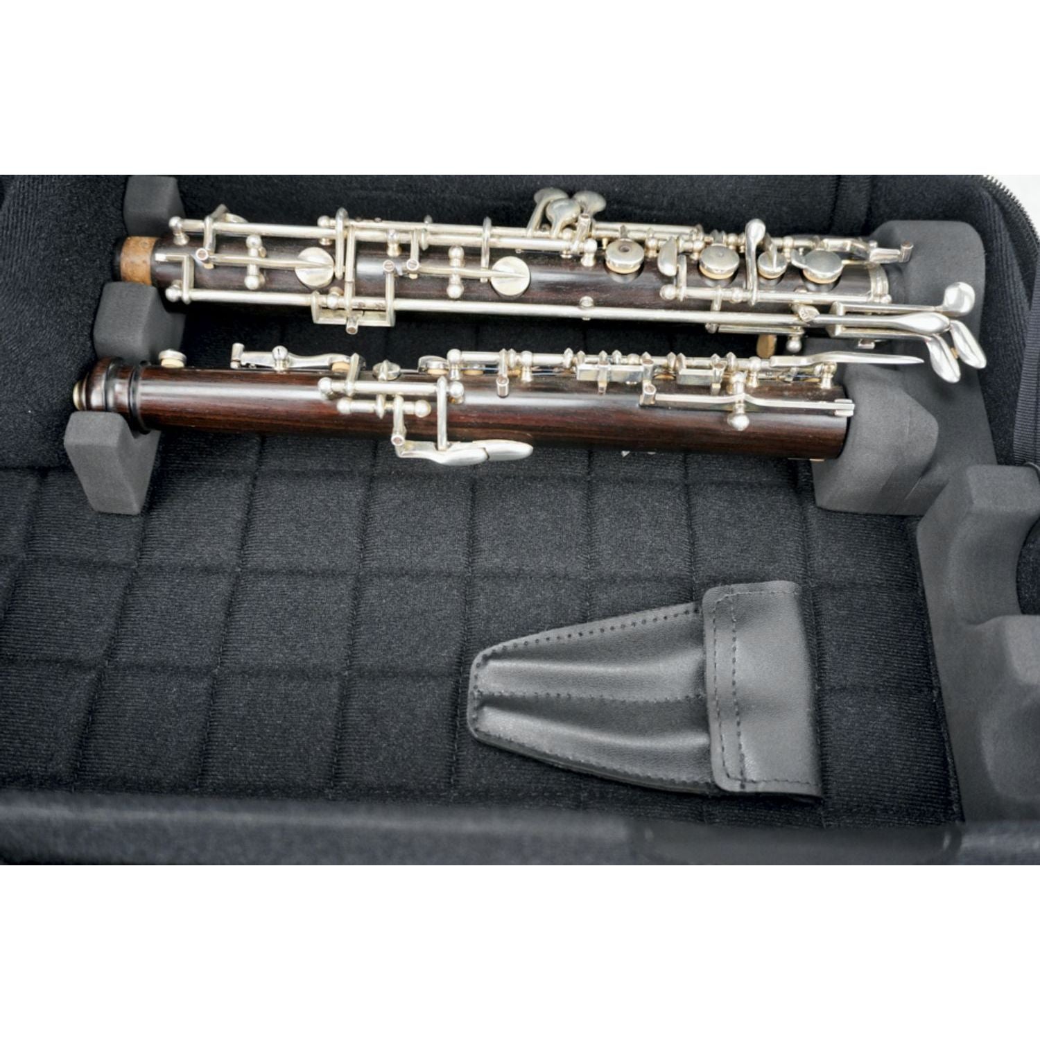This model fits one oboe and one English horn with a removable or fixed Bb extension. To make this possible, the padding must be moved accordingly. Accessories can be stored in the compartments inside or in the front pockets.