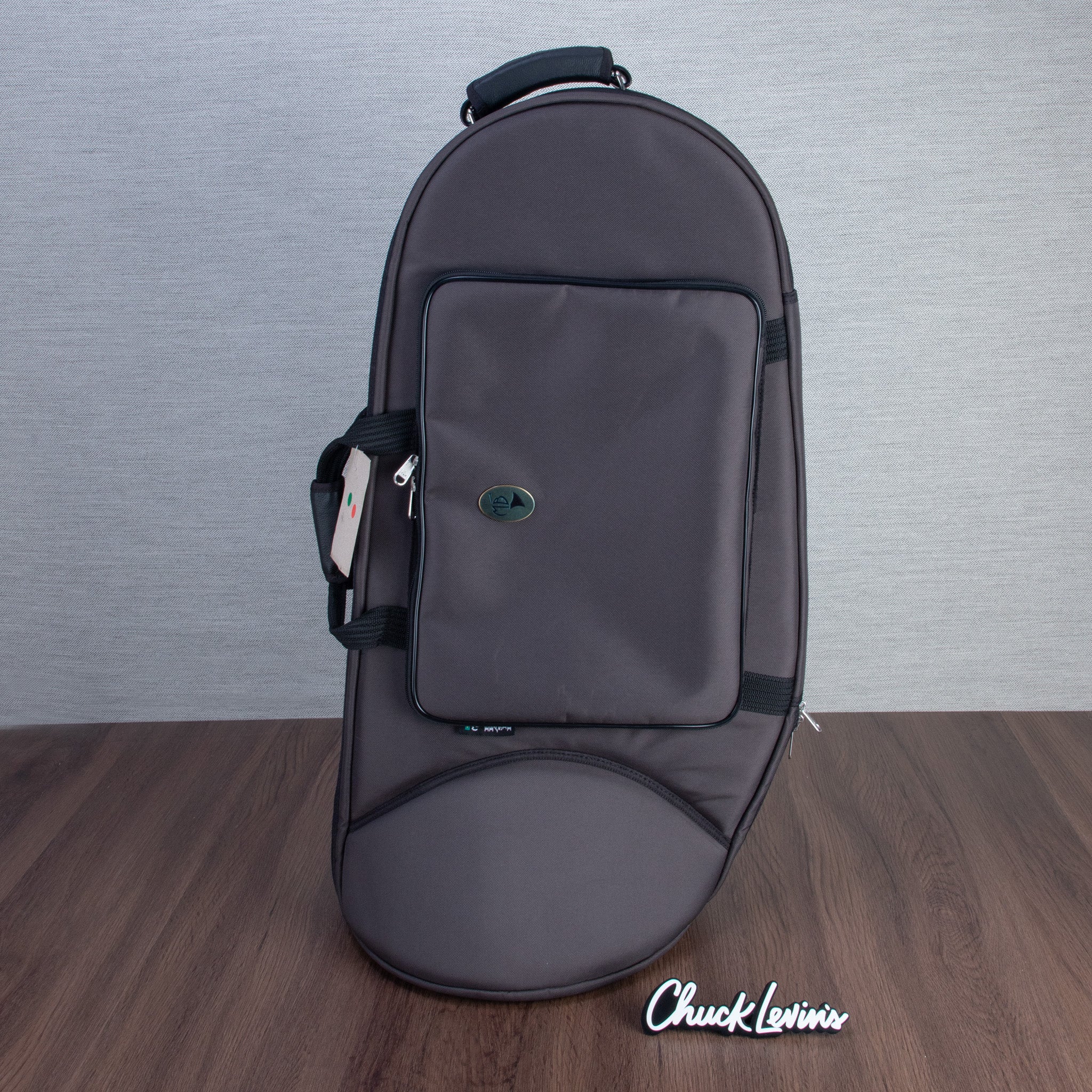 This light, soft case fits one euphonium. Accessories can be stored in the exterior detachable sheet music bag. The lid is made of foam, while the other parts contain fiberglass or carbon fiber to protect the instrument. This design significantly reduces weight. Marcus Bonna's soft cases are designed for everyday use, whether traveling by car, train, or bike. For longer journeys, such as those involving overhead bins on planes where greater protection is needed, we recommend using hard cases, which can be ordered through Chuck Levin's Band Sales at the phone number below.