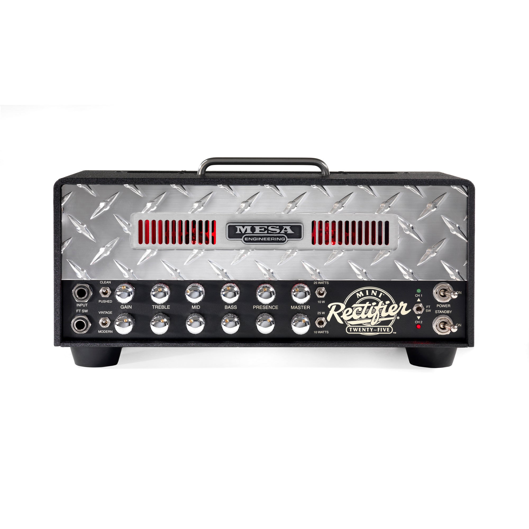 Experience Tone and Power that far exceed your expectations, and completely defy the confines of the Mini Rectifier Twenty-Five’s physical size. Whether you're rockin' hard or putting the immense versatility of the Mini's four Modes to bear on a variety of styles, you'll get years of inspiration and enjoyment from this little gas-in-glass-powered jewel. We always strive to build classics, icons that you'll treasure amongst your most valuable musical instruments. From the feedback they've received thus far, it seems the Mini Recto is on its way toward achieving that status. Try a Mini Rectifier Twenty-Five and see just how big 12 pounds can sound.