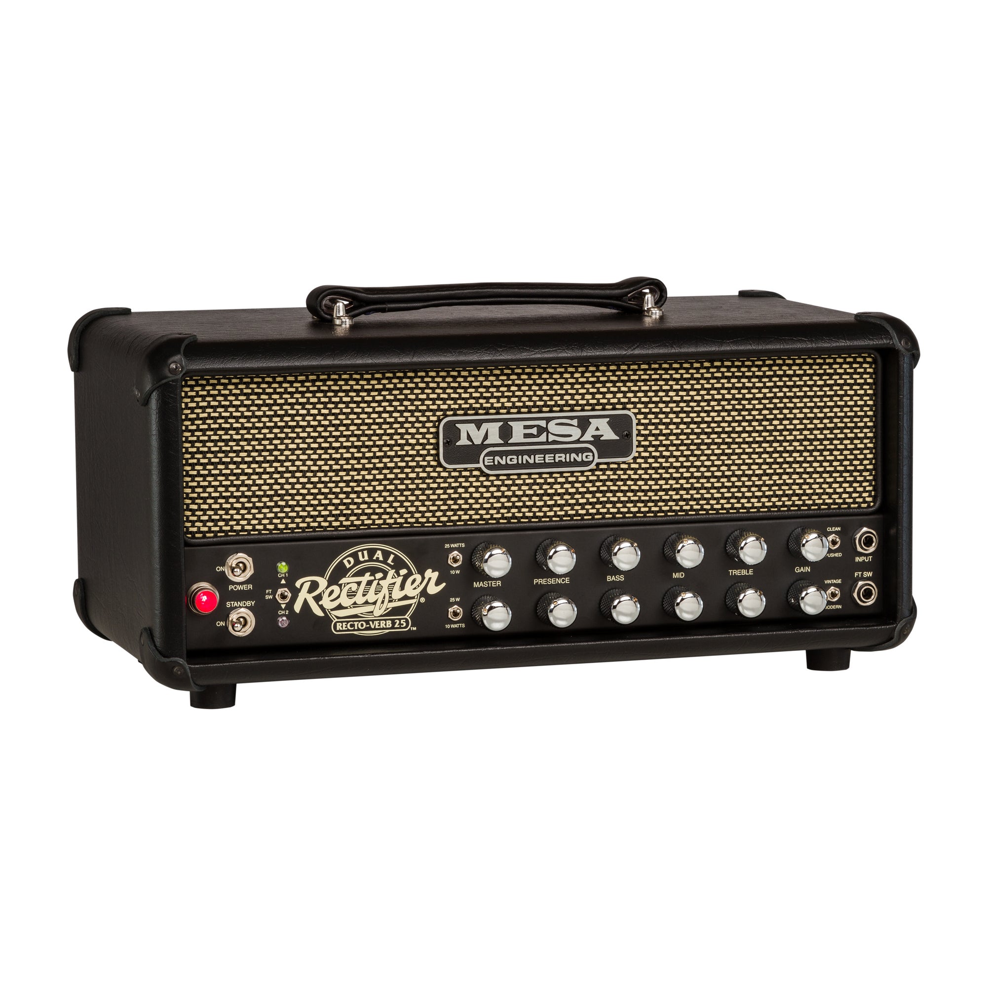 Introducing the Recto®-Verb™ Twenty-Five Head. These are the Reverb-endowed, fraternal-twins of the little Mini Rectifier® lunchbox that's been taking names all over the globe. These even mightier packages are slightly larger - just big enough to accommodate a 1x12 speaker in the case of the combo and long-spring Reverb tank in the case of the head. In both cases they boast all the same great performance that the Mini Rec™ is famous for and more. Plus, their classic, vinyl-covered birch cabinets provide a wide array of custom finish options to fully personalize them.
