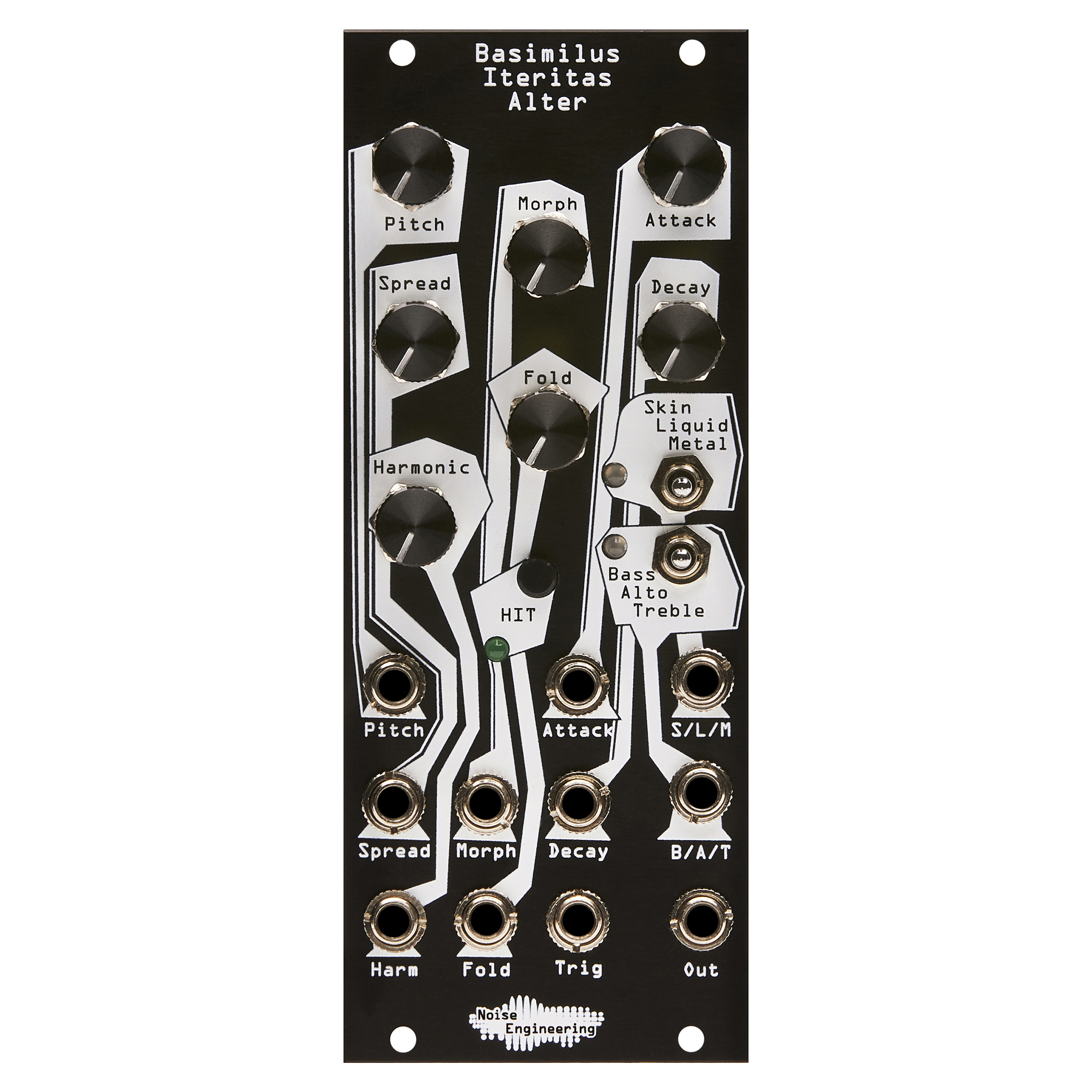 Basimilus Iteritas Alter is a 10HP parameterized digital drum synthesizer with its roots in the analog world. At its heart, it is a simple six-oscillator additive synthesizer with adjustable waveform, harmonic spread and decay. Adjustable attack including a noise oscillator is also included. These are summed and fed into an infinifolder for crunch and variety. Basimilus Iteritas Alter is an improved version of the discontinued Basimilus Iteritas. BIA is 2HP smaller, includes CV of switches, adds an third mode, and pitch range and knobs now offset rather than attenuate.