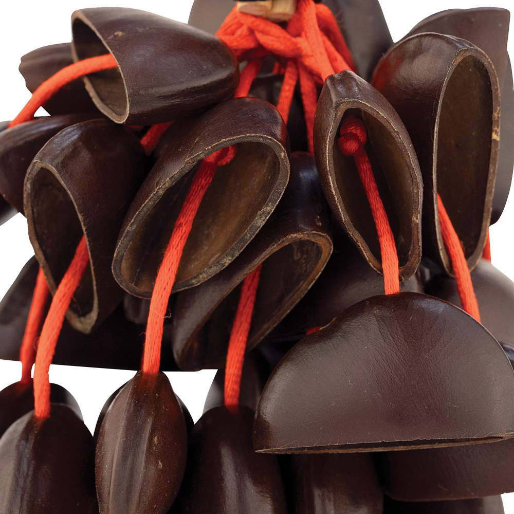 Pearl's Bendo Nut shaker is made from the fruit of the Artocarpus tree and produces a bright woody tone. The shaker features a 5-inch looped handle connected to 16 short strands of Bendo nuts. Each strand holds 2 hand-tied nuts.