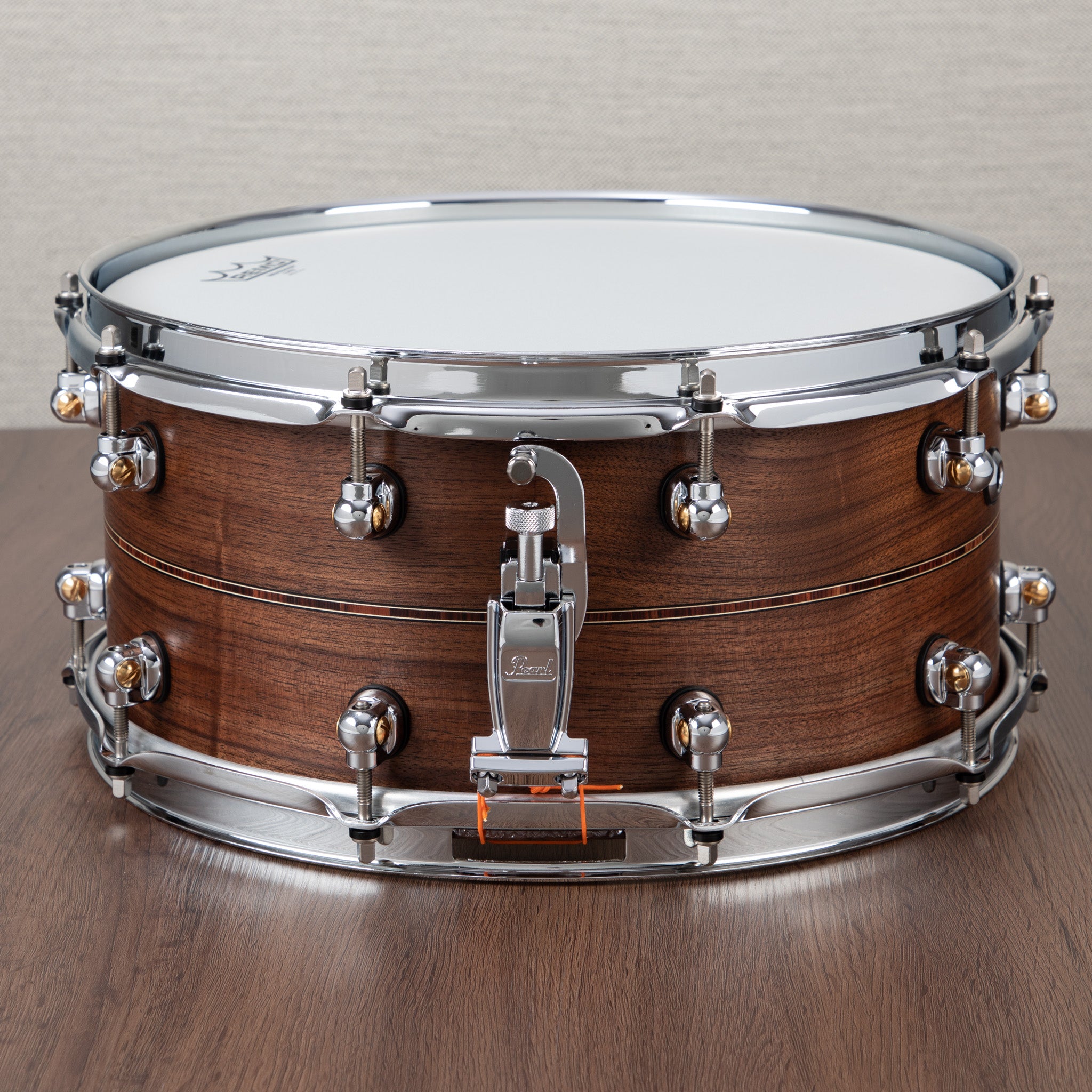 Crafted by a singular artisan with time-refined precision, Pearl Music City Custom Solid Shell Snare Drums are uniquely-refined percussion instruments crafted to elevate your entire approach to drums and drumming. This 14x6.5-Inch snare has a dark, dense inlay from the exotic Brazilian Rosewood family with a rich vertical grain. It's solid walnut, which has a fat growl with a naturally darker tone. Each shell is reinforced at each edge with 6mm solid Maple rings and hand routed with 45-degree bearing edges. The final assembly of this snare features Pearl STL150 Swivel Lugs and Stainless Steel tension rods of secure tuning accuracy, the effortless SR017 Snare Strainer, Ultra-Sound snare wires, and 2.3mm Superhoop II Triple-Flanged hoops.