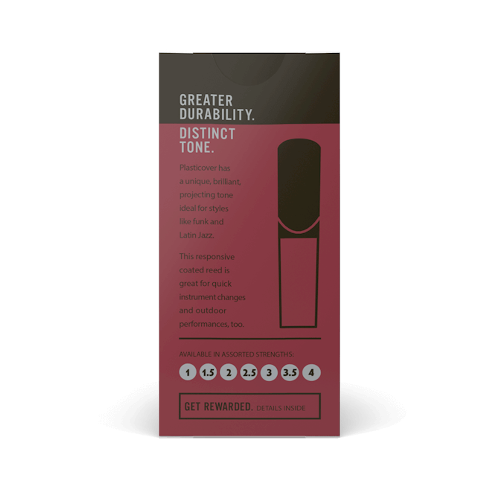 Plasticover features a brilliant, projecting tone that gives voice to many music styles. Favored by rock and pop performers, Latin jazz artists, and within all corners of jazz, this coated cane reed is ideal for quick instrument changes and enduring extreme weather conditions. Ideal for jazz, outdoor marching, and rock.