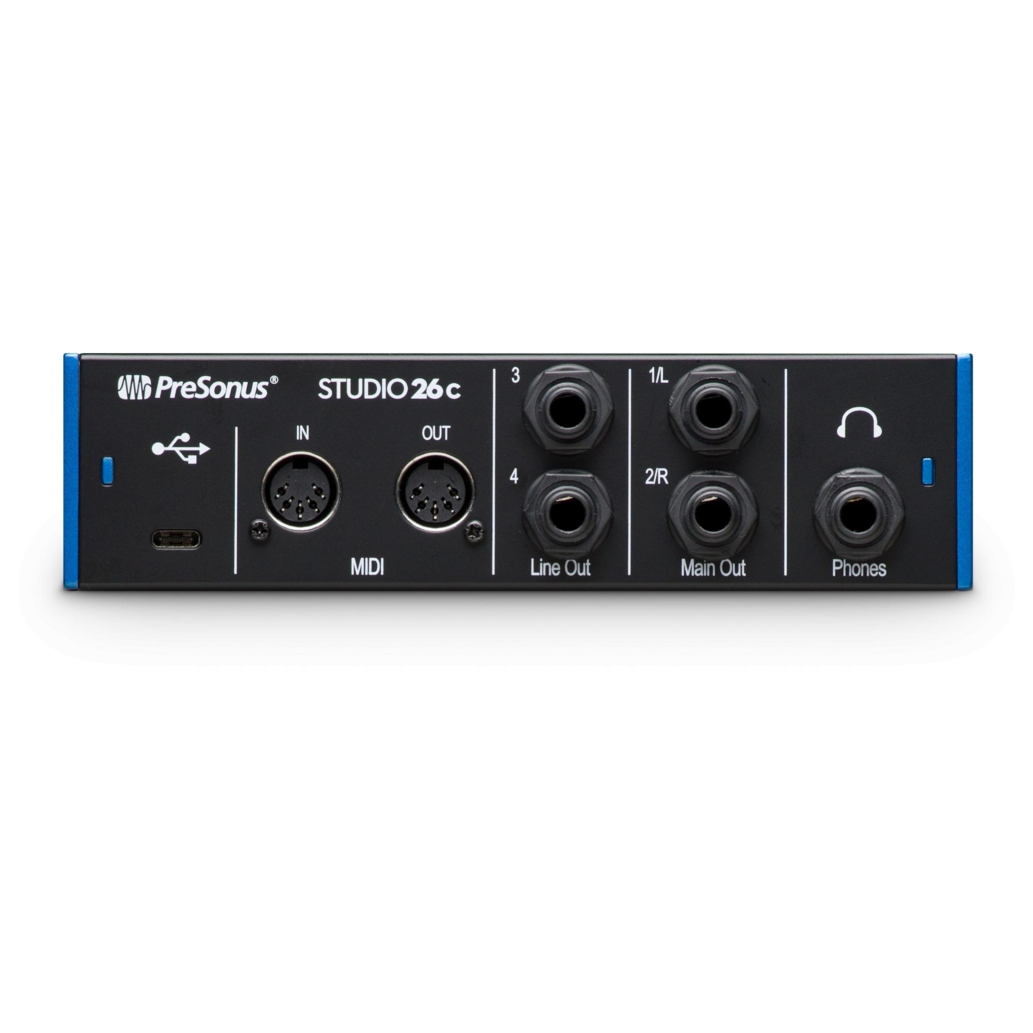 Ideal for DJs, mobile musicians, and electronic musicians who want excellent audio quality in a sturdy, portable form factor, the bus-powered Studio 26c 2-in, 4-out audio interface records at up to 192 kHz and features mic/line/instrument inputs, DC-coupled line outputs, MIDI I/O, and a Cue Mix A/B button. A complete, all-in-one recording package, the Studio 26c comes with PreSonus award-winning Studio One Artist music production software for macOS and Windows and includes USB-C to USB-C and USB-C to USB-A cables for compatibility with most computers.