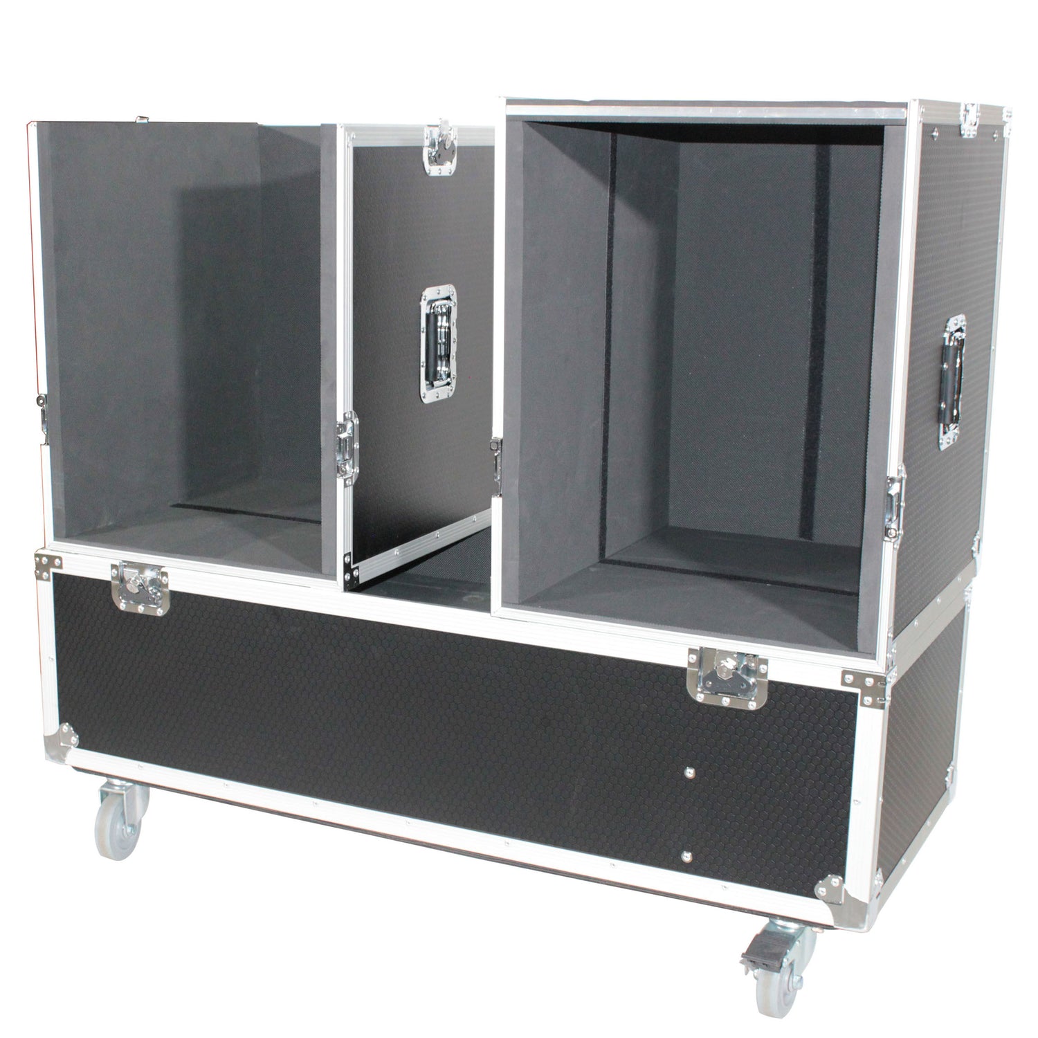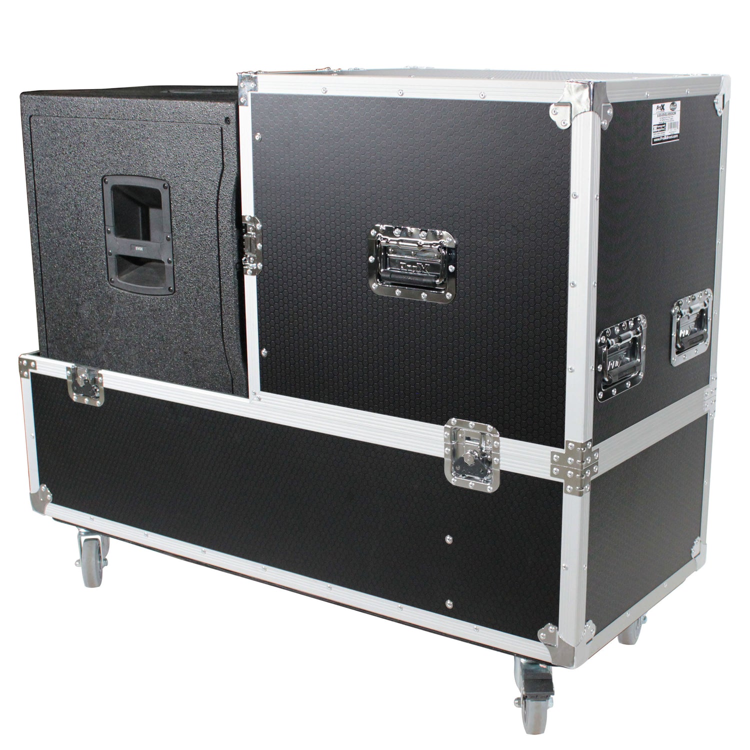 ProX X-EVO1250X2W ATA Flight Case for 2x RCF EVOX12 or EV Evolve 50 Compact Arrays Fits Two Speakers and Subwoofers. X-EVO1250X2W is designed specifically to store and protect up to (2) RCF EVOX 12 or EV Evolve 50 Column Line Array / Subwoofer speakers. Stores up to two subwoofer units plus two arrays inside the case. This professional speaker case employs a 3/8" Honeycomb laminated plywood that has a hard shell with internal impact-resistant padding to provide the best protection for your investment. No matter where you take your speakers, you can have peace of mind, nothing will get damaged during transit or in storage.
