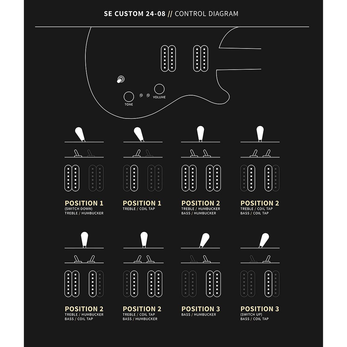 The Custom 24 is the quintessential PRS guitar: the iconic guitar that started it all back in 1985. The Custom 24-08 keeps all the foundational specs of the instrument, while taking the Custom platform to new sonic territories. Like the Core Series instrument, the SE Custom 24-08 features two mini-toggle coil-split switches that individually split the humbuckers into true single coils for a total of eight pickup configurations. Classic design elements include a maple top, mahogany back, rosewood fretboard, 24 frets, 25” scale length, bird inlays, signature headstock logo, and PRS patented molded tremolo.