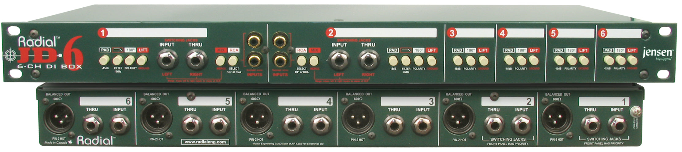 The Radial JD6 is a high performance 6-channel rackmount direct box designed for the most demanding studio and live touring applications. Stemming from the industry standard Radial JDI, the JD6 incorporates six high performance audio transformers with extra RF filtering to ensure optimal signal transfer without noise, distortion or artefact of any kind. These are able to withstand extreme signal levels without choking. This makes the JD6 particularly effective when managing high output active devices such as digital pianos that will often overload most direct boxes or preamps.