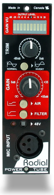 The Radial PowerTube is an 'old school' 100% discrete class-A vacuum tube microphone amplifier intended to capture the essence of the voice or instrument while adding the rich harmonics, warmth, and character of a transformer coupled tube circuit.