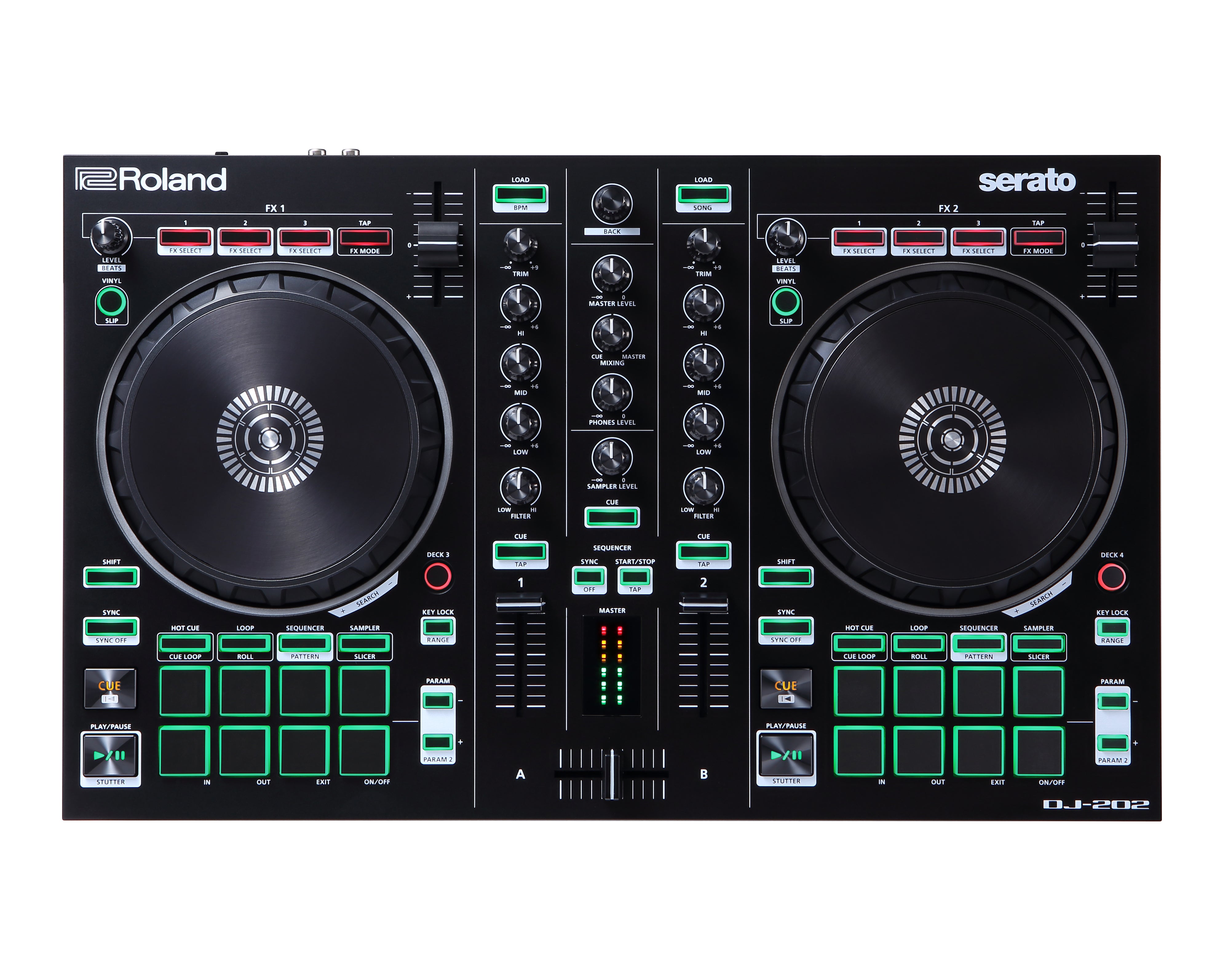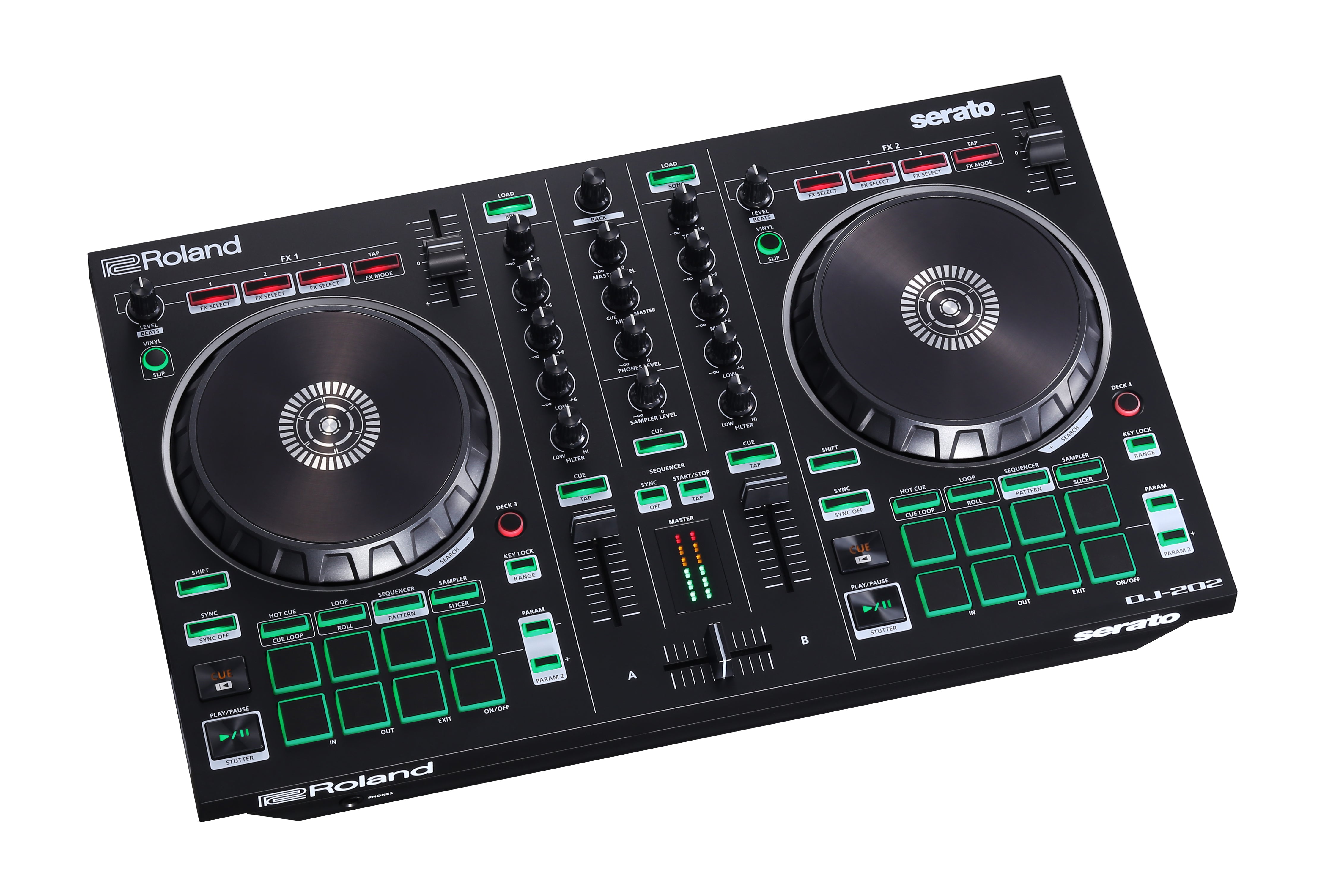Mix, Scratch, Sequence. Get Started. The Roland DJ-202 is a forward-thinking Serato DJ Intro controller that gives DJs the features and layout of a full-size professional controller in a rugged and portable unit. The compact DJ-202 preserves the concept of the flagship DJ-808 and streamlined DJ-505, allowing unparalleled flexibility to DJ, remix, and produce beats on the fly while performing live or creating in the studio. With its large, low-latency platters, dedicated pad and transport controls, onboard sequencer, and mic input with professional vocal FX, the DJ-202 packs in the most features of any controller in its class.