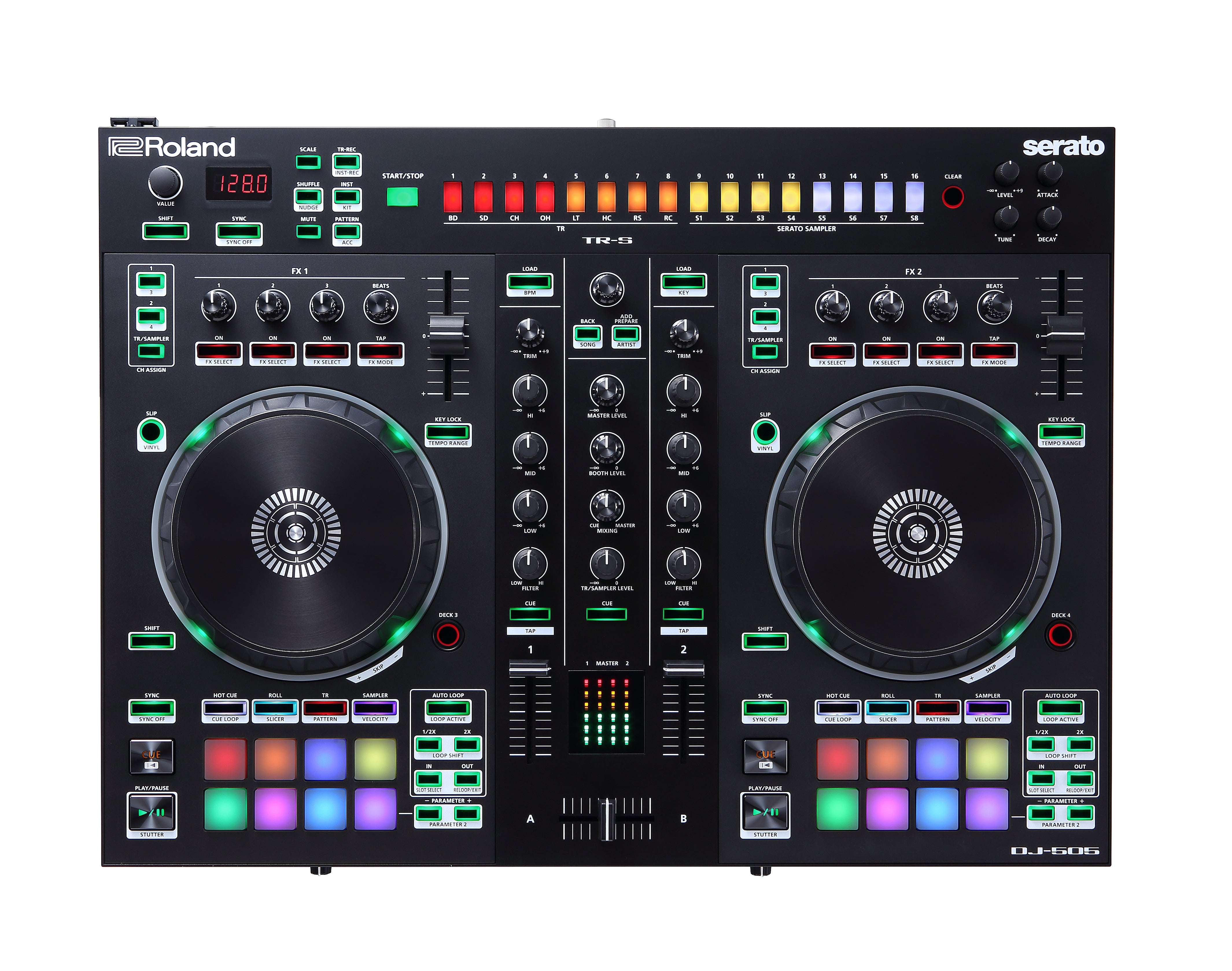 The Roland DJ-505 is a two-channel, four-deck Serato DJ controller that blends the advanced performance capabilities of Serato DJ with the legendary sounds and sequencing of Rolands TR-808, TR-909, TR-606*, and TR-707* drum machines. The DJ-505 gives you the tools to move beyond mixing music to creating beats and rhythms on the fly that sync to your Serato DJ tracks, enabling the creation of unique transitions, live remixes, beefed-up classic tracks, or your own original music. Â