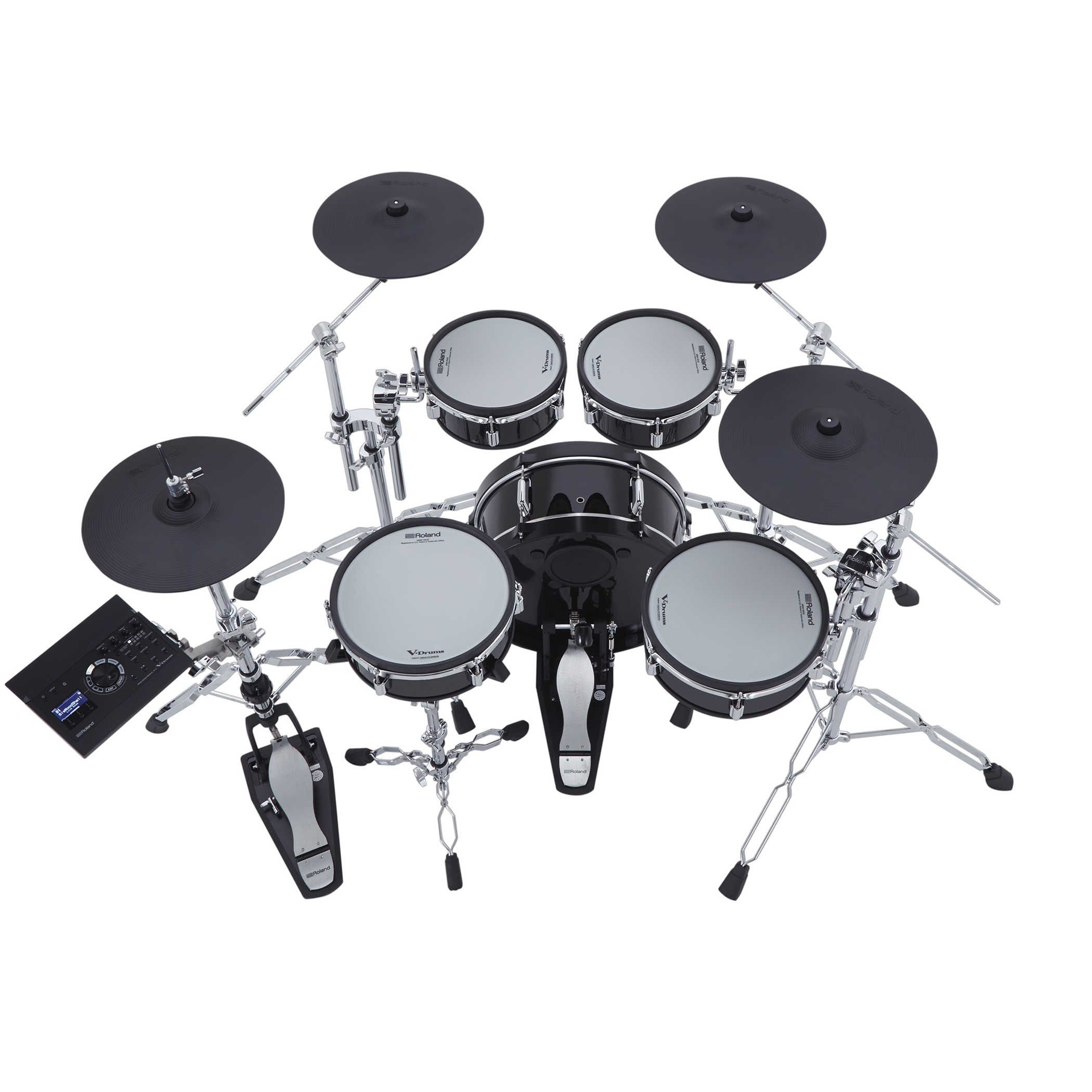• Space-saving V-Drums Acoustic Design kit with shallow-depth wood shells and upgraded double-braced chrome stands