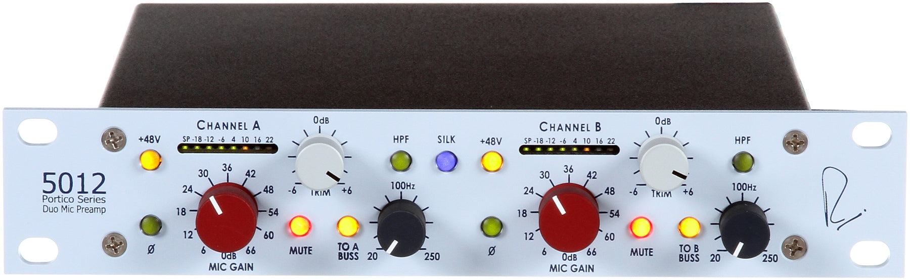 The Portico 5012 is a dual-channel mic pre featuring Rupert Neve's custom input and output transformer designs. In addition to individually selectable phase, mute, phantom power, and a fully sweepable high pass filter, the 5012 incorporates a "Silk" circuit which yields the rich warmth and presence of his renowned classics.