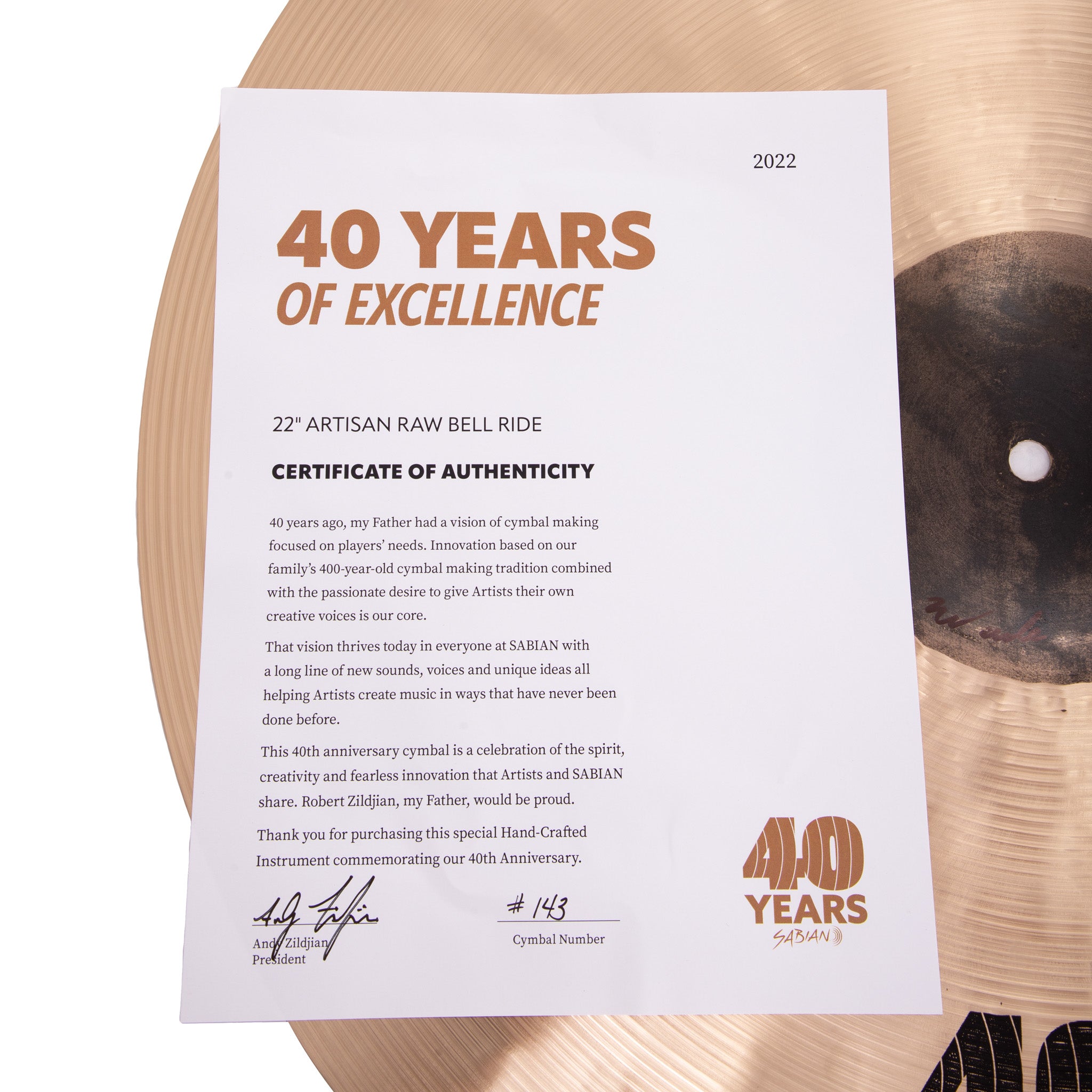 Sabian 40th Anniversary Artisan 22-Inch Raw Bell Ride Cymbal - #143