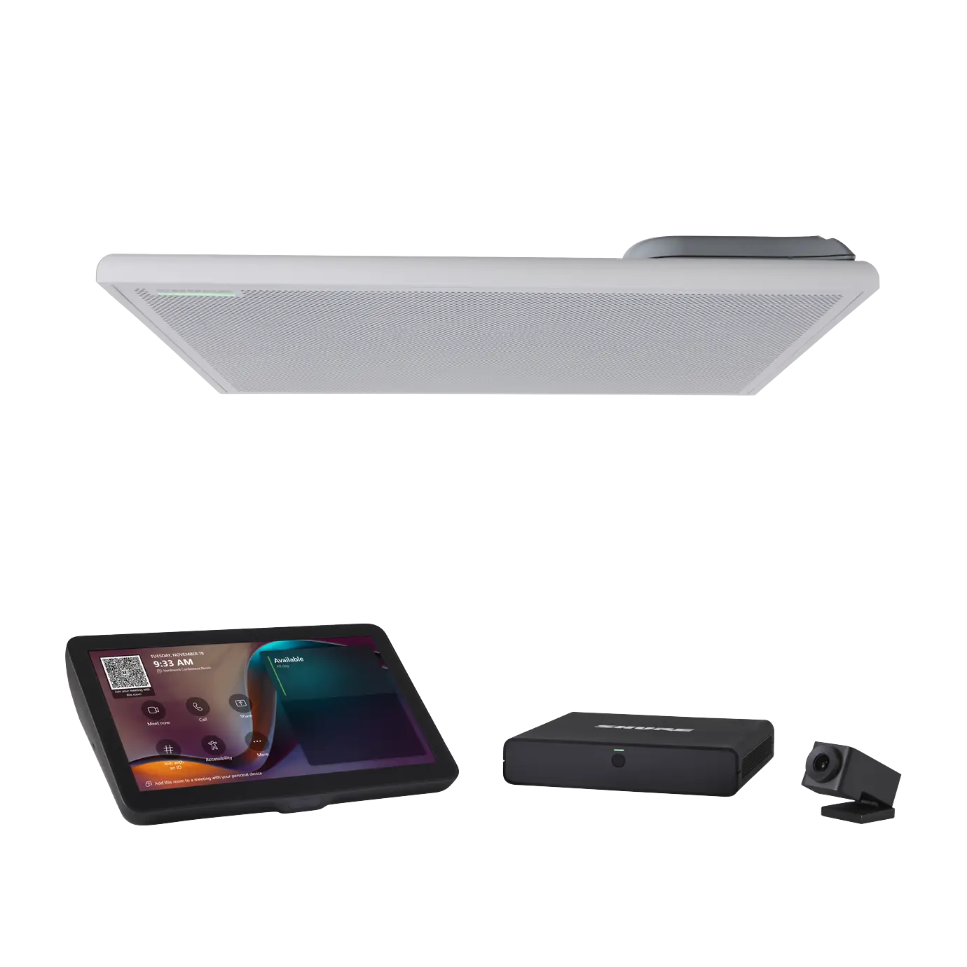 Boost collaboration with simple and secure Microsoft Teams Rooms conferencing kits. With zero-touch provisioning, you can effortlessly deliver high-quality audio and video experiences in your small, medium, and large meeting and collaboration spaces, up to 33 x 18 ft (10 x 5.5 m). The component-based systems provide everything you need - automatically. No programming or adjusting of audio and video settings is required. All kits include a powerful Windows-based Teams Rooms compute with Shure’s premium audio signal processing, an intuitive touch panel, a superior all-in-one ceiling array microphone and loudspeaker, and intelligent, high-resolution video.