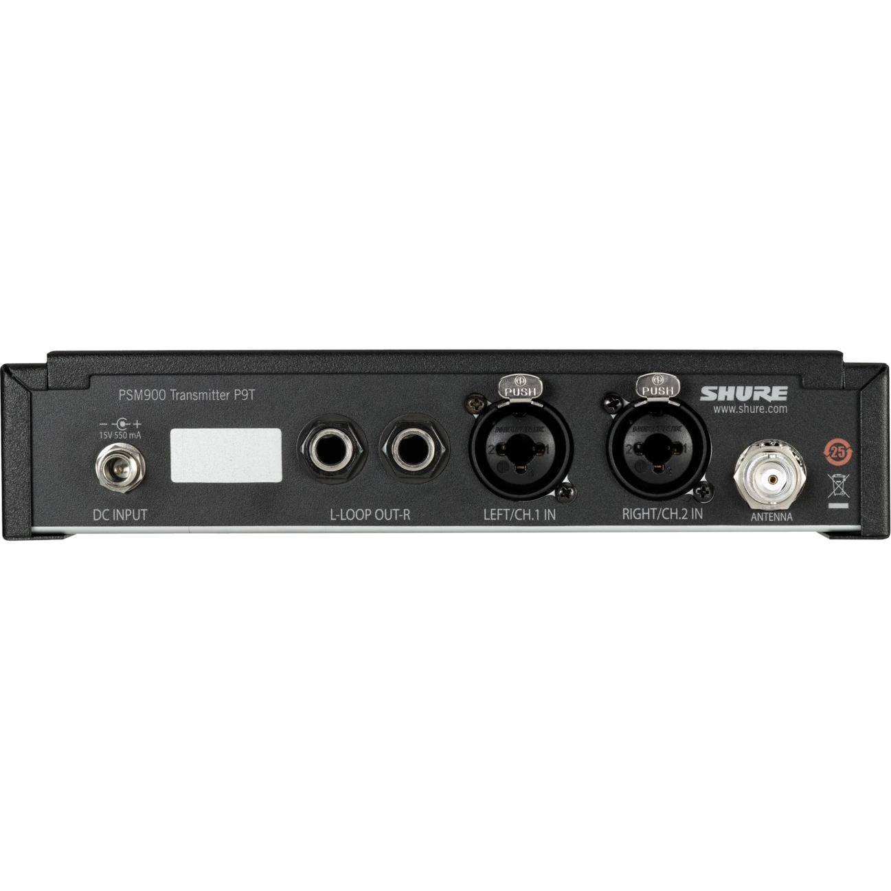 The P9T is a half-rack wireless transmitter used in conjunction with the P9R Bodypack receiver as part of the PSM®900 Wireless Personal Monitor System. It offers state-of-art technology like CueMode (patent pending), Scan and Sync, and RF mute switch for easy setup and operation. Connections include balanced 1/4-inch and XLR, loop out, and headphone out. Includes rack-mounting kit, front or back mountable antennas, and power supply.