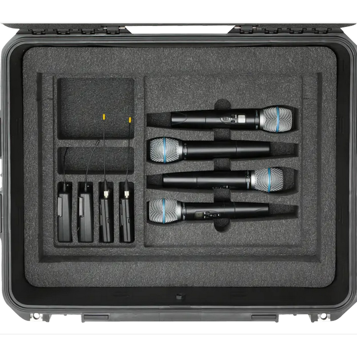 Custom-cut foam to accommodate four wireless hand held transmitters and four body pack transmitters