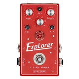 The Explorer is an optical six stage analog phaser, lovingly handcrafted with Spaceman effects' hyper detailed approach to usability, and tone. Named after the first satellite put into orbit by the United States in 1958, the Explorer was the first phaser launched by Spaceman. Years later, they are pleased to bring you a small form factor reissue of this classic circuit with all the deluxe features of the original. Sometimes liquidy smooth, sometimes chewy and lush, the fluid frequencies squiggle and flourish like the unrelenting ebb and flow of the sonic tide.