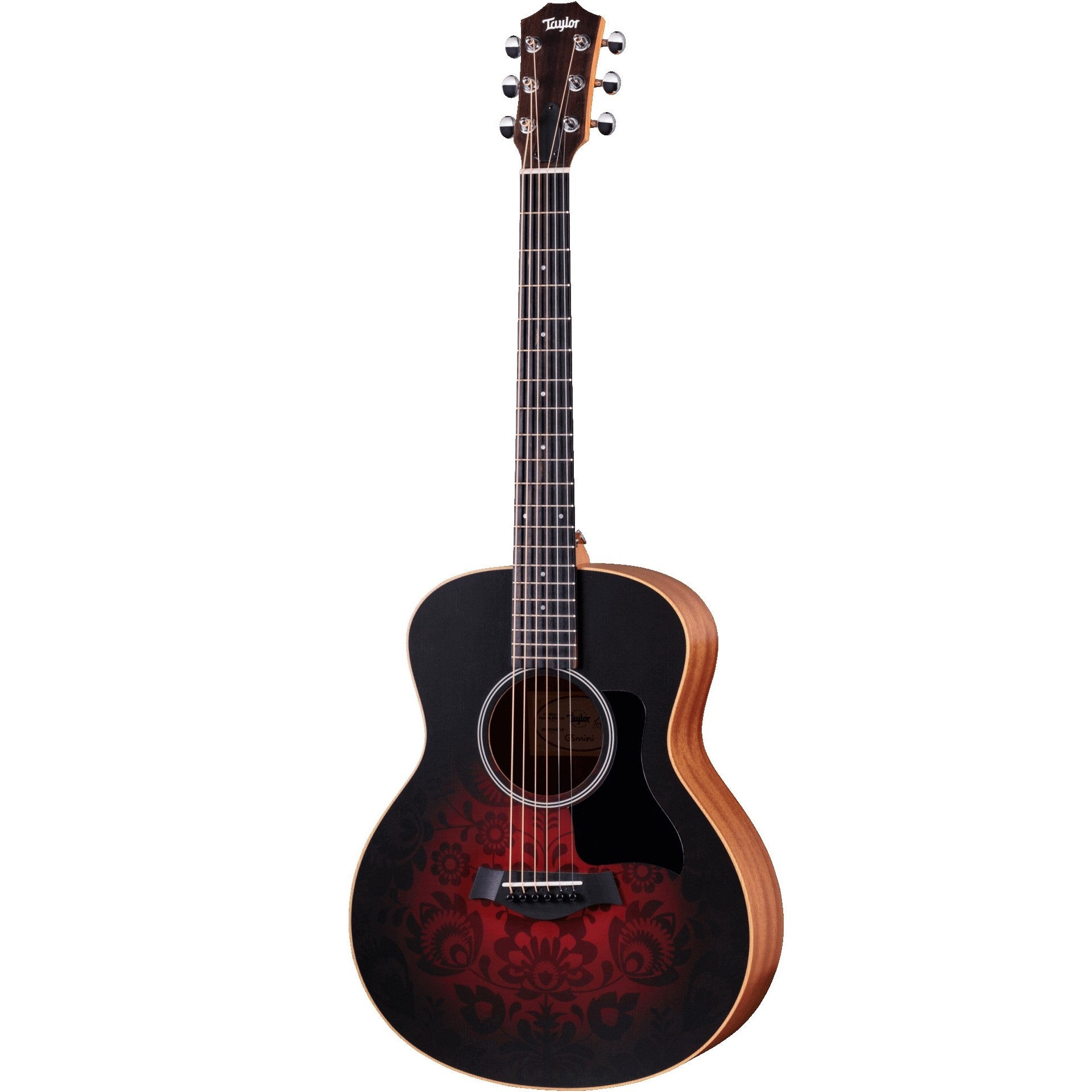 Styled with an elegant, floral-inspired soundboard design, the GS Mini-e Special Edition, Victorian Burst offers sophisticated visuals, rich tones and effortless playability. With its scaled-down, matte-finished Grand Symphony body and hand-friendly proportions, the GS Mini is a joy to play for players of all levels. This special-edition model features layered sapele back and sides paired with a torrefied Sitka spruce top, yielding a bold, clear response, surprising projection and a balanced tonal profile. Our special roasting process for the top ensures a sweet, played-in sound right out of the box. A black pickguard accentuates the ornate red and black artwork, while the top’s dark burst treatment adds a dramatic vintage flair. A slim neck profile and shorter scale length with low action translate to a relaxed feel and a comfortable playing experience. Whether you’re setting out for an epic journey or strumming around the house, the award-winning, travel-ready GS Mini is the perfect musical companion. This model comes equipped with an ES-B pickup, which includes a digital tuner, and it ships in a protective structured gig bag.