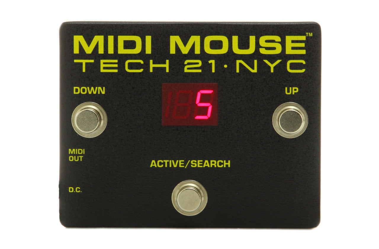 The Tech 21 MIDI Mouse is designed to take the frustration and confusion out of MIDI. Easily access 128 patches on any of the 16 selectable MIDI channels by using the Up and Down footswitches to locate your program, with no banks to select. A third footswitch toggles between Search mode to locate programs and Active mode to send the program number to the MIDI output.