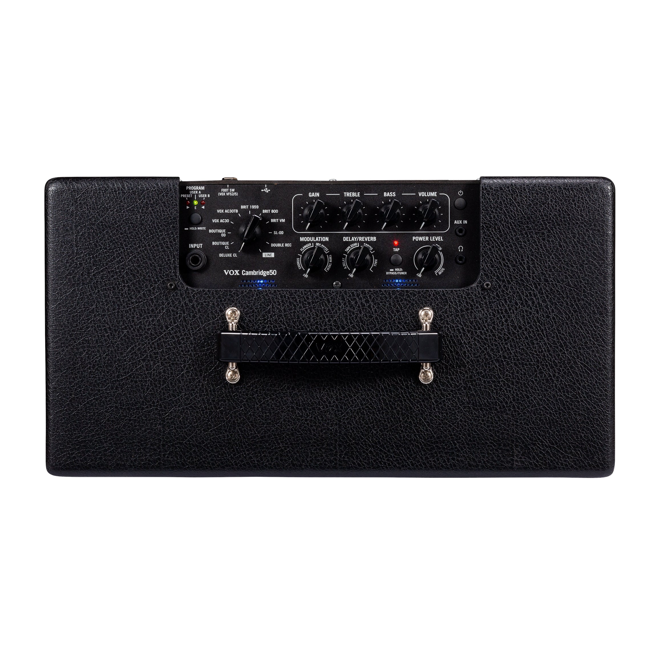 The VOX Cambridge50 features a Nutube, the new-generation vacuum tube. Using electro-luminescent technology with the same structure as a conventional vacuum tube, the Nutube has been featured in a variety of products from VOX and others. The distortion and sense of compression that you expect from a vacuum tube, and even the response and playing feel, perfectly capture the feeling of playing a vacuum tube. In addition to the light-weight design that was unobtainable by a conventional vacuum tube amp, the Nutube brings additional unique advantages such as being maintenance-free and cost-effective.