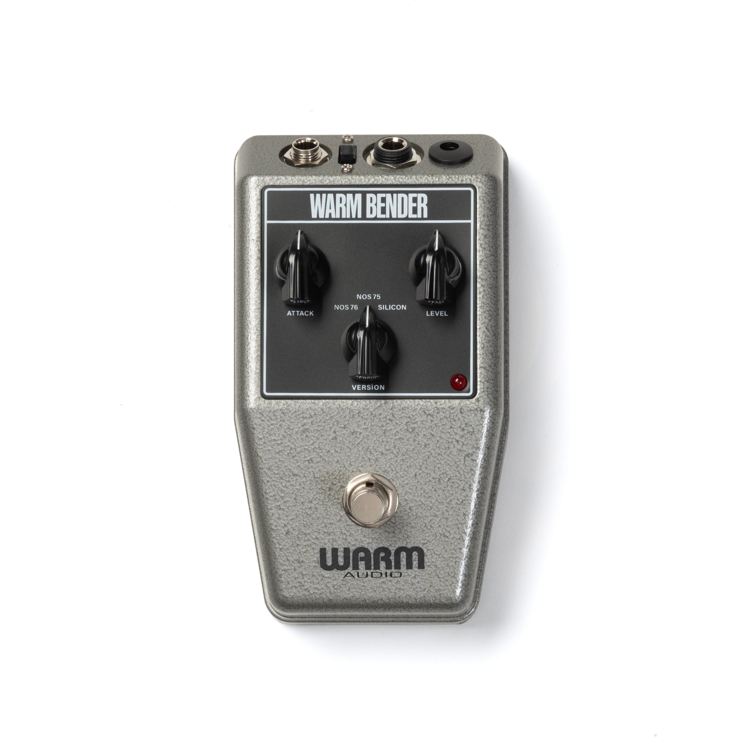 WarmBender has the classic ‘Level’ and ‘Attack’ controls of the NOS 75 & NOS 76 Tone Bender-style pedals. Level adjusts the output volume of the pedal. It regulates the overall loudness of the effect. The Attack control determines the level of distortion/sustain of the fuzz. Added controls include a rotary Version switch to choose the distinct, 100% analog bender-style circuit and a SAG switch rear-mounted to starve the pedal of voltage.