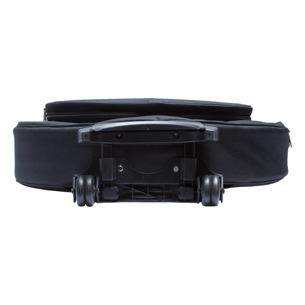 The 22" Premium Rolling Cymbal Bag features a 16" expandable HiHat pocket for increased cymbal capacity, perfect for storing multiple HiHats, effects, and stacks. With a padded middle accessory pocket/divider and clutch holder, this bag has a space for everything. The four graduated cymbal dividers keep your cymbals safe while not getting in the way during setup and teardown. The retractable handle system and padded carry handle make for easy transportation. With reinforced front and back panels and a rubber cymbal protection system built into the inside and outer bottom, this bag is ready to stand up to life on the road.
